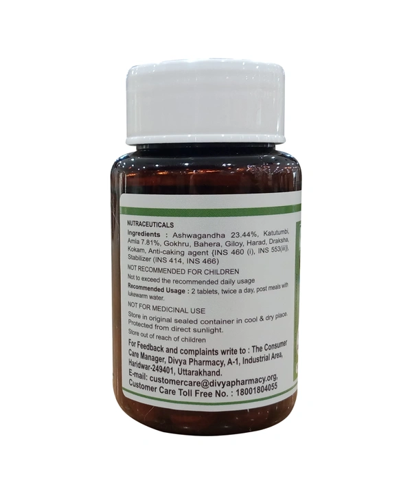 Ingredients: Ashwagandha 23.44%, Katutumbi, Amla 7.81%, Gokhru, Bahera, Giloy, Harad, Draksha, Kokam, Anti-caking agent (INS 460 (i), INS 553(iii)}, Stabilizer (INS 414, INS 466)